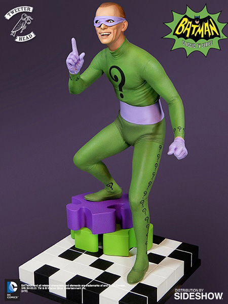 Sideshow Collectibles and Tweeterhead are thrilled to introduce the latest villain - the Batman "Riddler Maquette"! This incredible collectible features Riddler as portrayed by Frank Gorshin donning his classic green suit with a question mark on his chest atop a puzzle themed base.