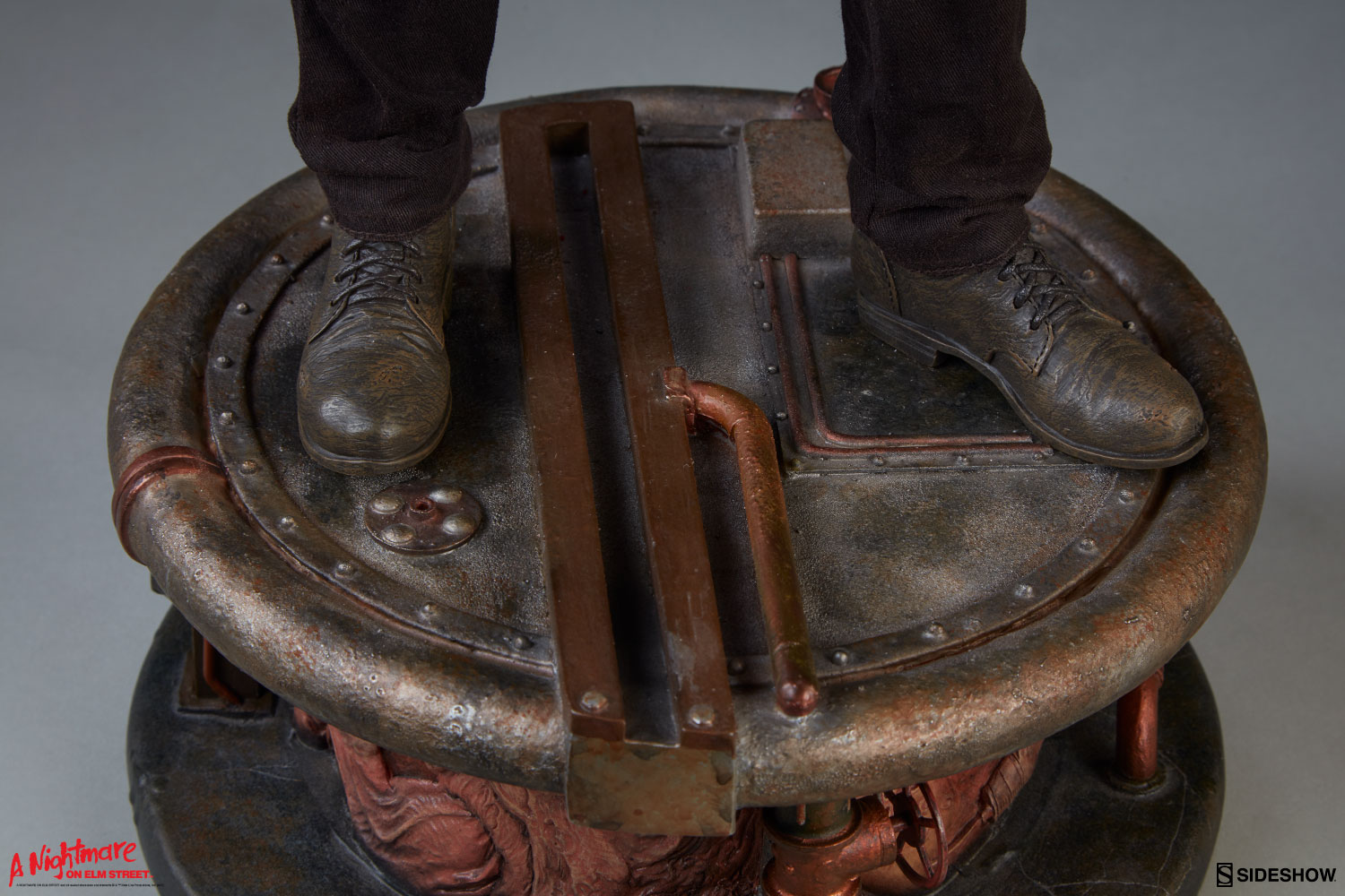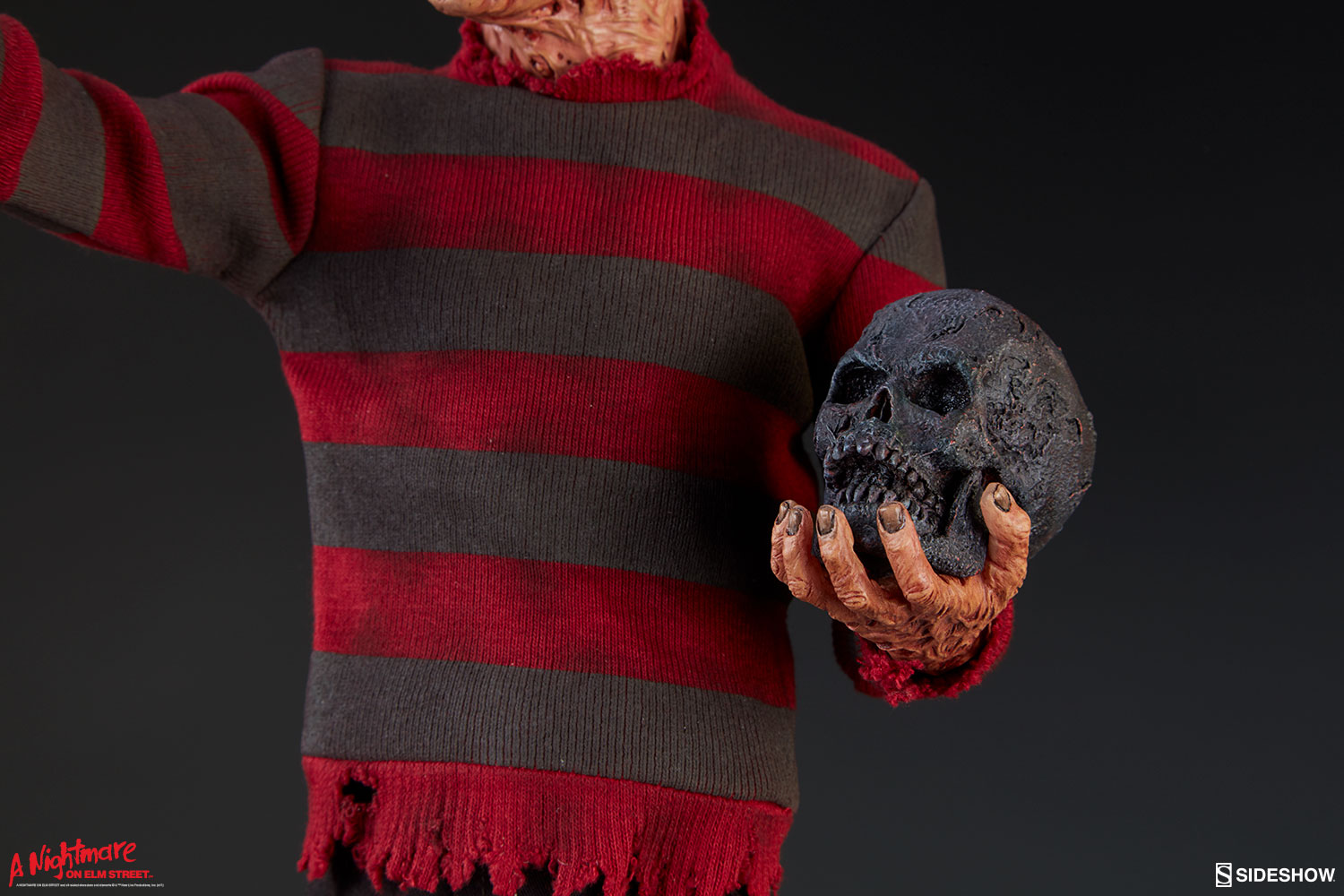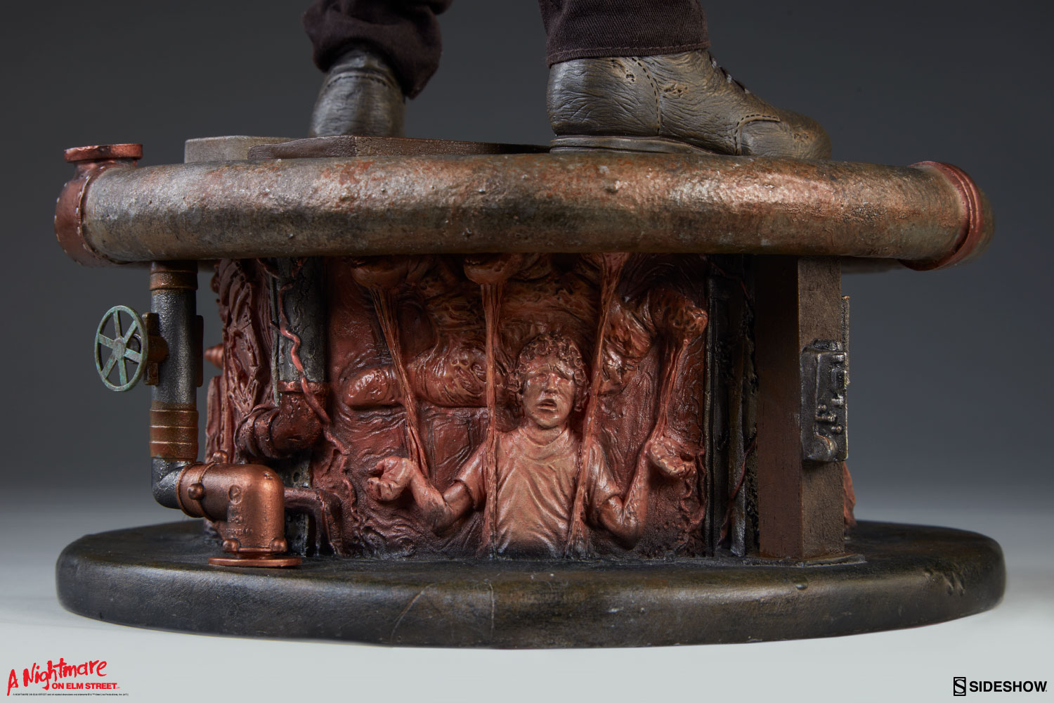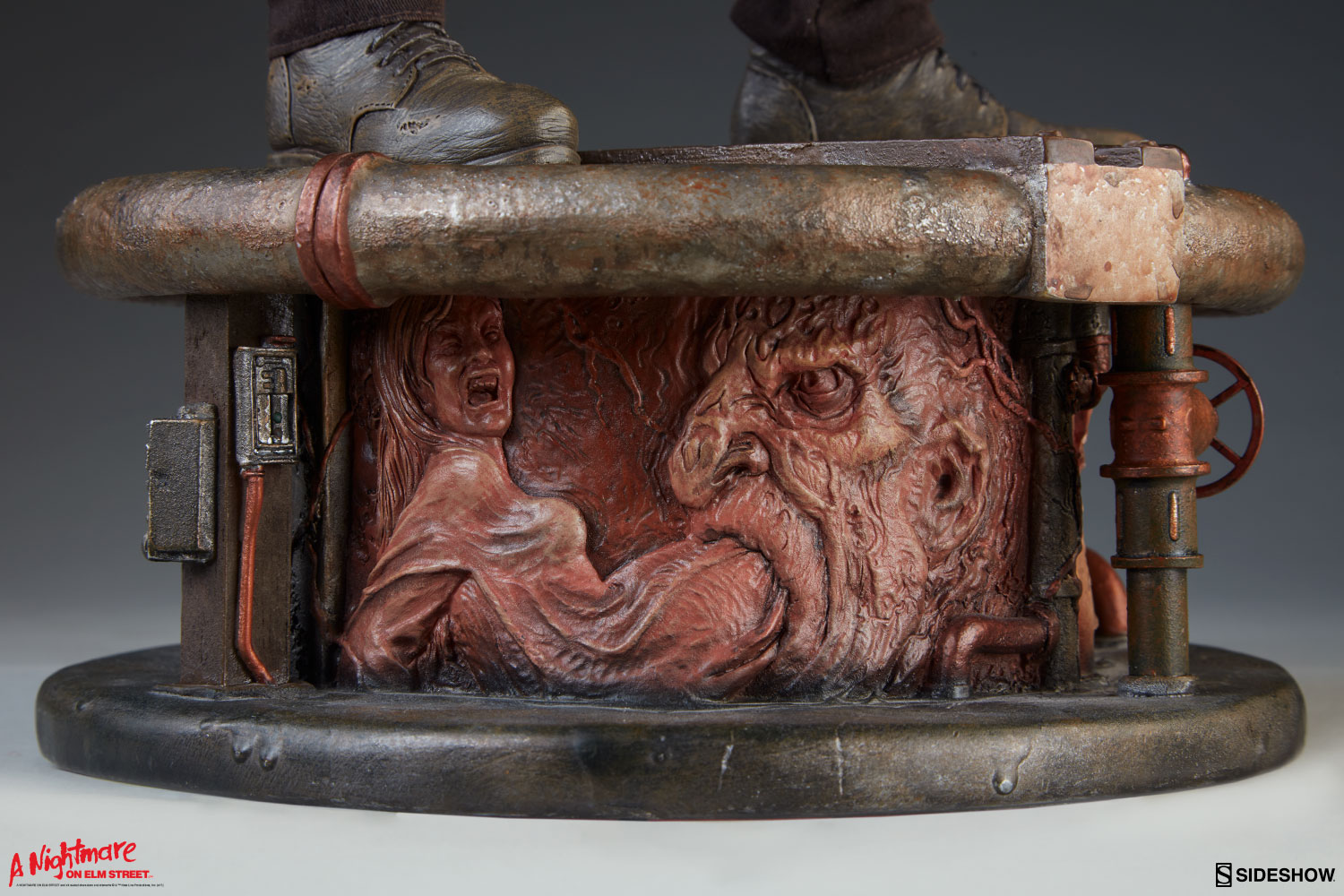 Clad in his iconic worn and weathered striped sweater and hat, Freddy stands atop a base adorned with the visages of past victims. The statue itself emphasizes the swagger that Freddy often brought onto the screen – his leering face accenting the point that if you meet him, you will likely not wake up from your nightmare.