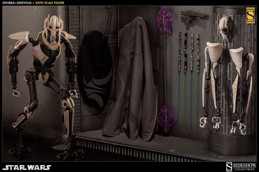 With the Galactic Republic in shambles, a powerful new Confederacy of Independent Systems forms a droid army of incomprehensible size. General Grievous, a brilliant military strategist and remorseless killer, leads the Armies of the Confederacy, waging a deadly war for control of the galaxy. Sideshow Collectibles is proud to introduce the long-awaited General Grievous Sixth Scale Figure. Engineered with meticulous attention to detail, the fully articulated body can achieve countless poses, recreating vivid scenes of battle and victory. Fully equipped with detailed weapons and accessories including switch-out fused and split arms, four lightsabers, electro staff, and a hand-tailored fabric cape, the General Grievous Sixth Scale figure is an essential addition for any Star Wars collector